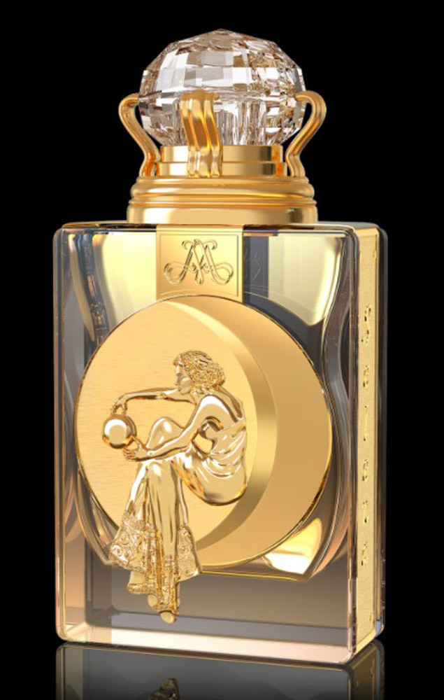 На особливу увагу заслуговує виконання флакона, створеного вручну. Кришталева пляшка інкрустована золотистим барельєфом із зображенням жінки. Дерев'яна коробка також створена руками майстрів та оббита шкірою.