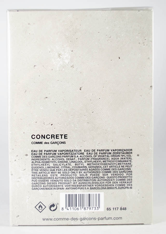 Аромат 2017 року для чоловіків і жінок Comme des Garcons Concrete, з упевненістю можна назвати найнезвичайнішим парфумом останніх років. Піраміда побудована навколо спецій, але подані вони в сучасному оформленні і не несуть зайвого класичного характеру. Зі стартового тону перед нами розкривається кмин у кроні із зерен кардамону. На особливу увагу заслуговує дизайнерське рішення флакона, що нагадує шматок бетону, що і відбилося в назві.