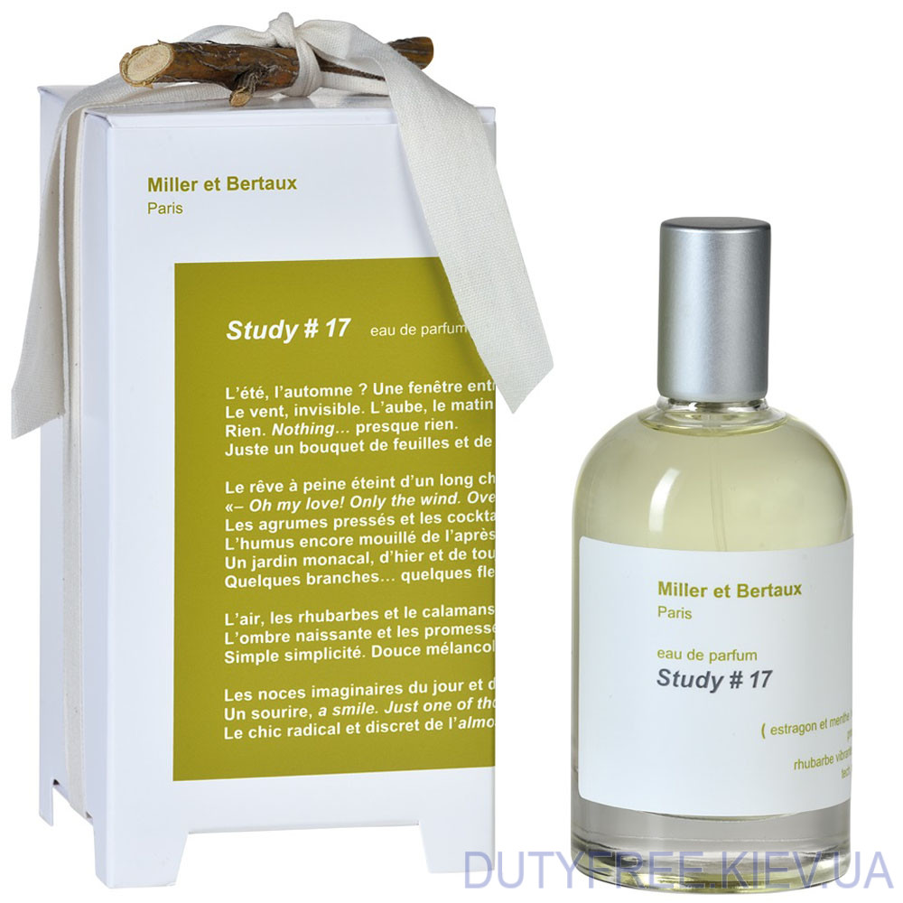Аромат для особенных натур Miller Et Bertaux New Study # 17, это ультра современная парфюмированная вода, созданная небольшой торговой маркой из Франции. Парфюм довольно сложный по звучанию, хоть в нем и нет ничего второстепенного. На первое место авторы предложили смесь из бергамота и горького тархуна, поданного с зеленой начинкой и холодной мятной подушкой.